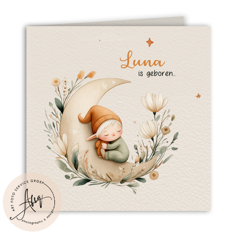 Een dromerig digitaal geboortekaartje met een slapend kindje op de maan, omringd door bloemen en zachte pastelkleuren. Perfect voor een liefdevolle aankondiging van jullie kindje.