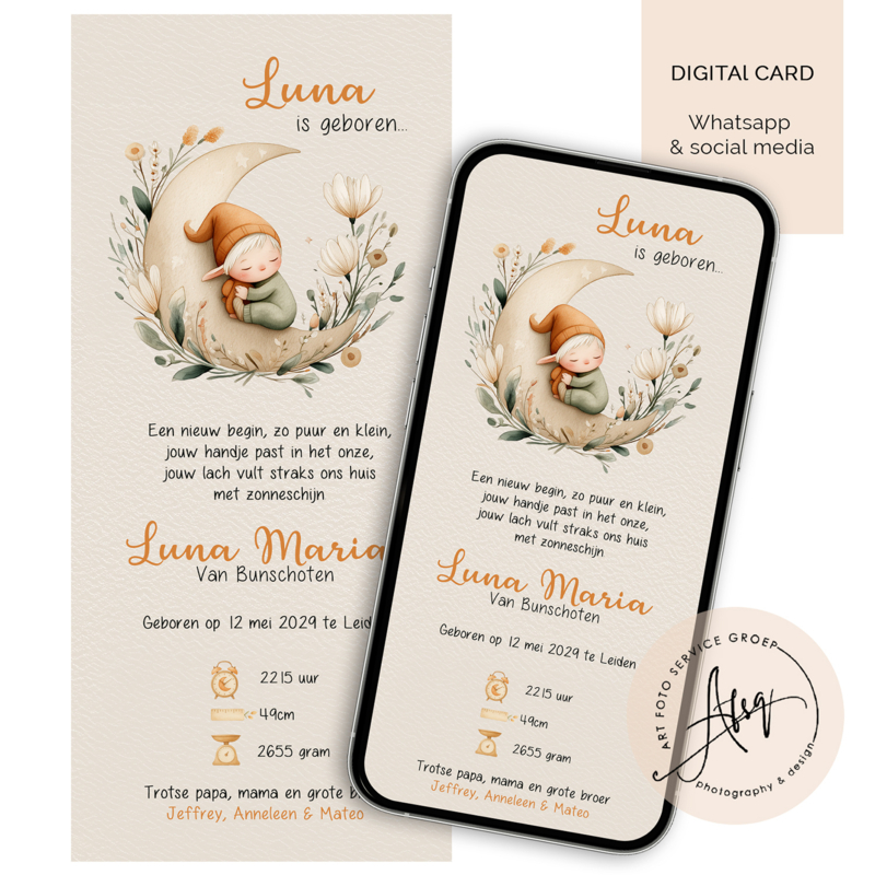 Een digitaal geboortekaartje is een geboortekaartje van 1 afbeelding met de foto van je eigen kindje die je kunt posten op jouw social mediakanalen of je kunt het kaartje versturen via Whatsapp of e-mail.