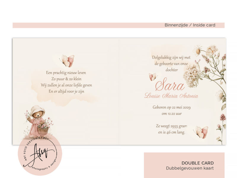 Dit lieve geboortekaartje zonder foto straalt warmte en zachtheid uit. Het ontwerp toont een schattig beertje in een roze jurkje met een mandje vol bloemen, omlijst door sierlijke veldbloemen. Perfect voor ouders die kiezen voor een uniek en romantisch geboortekaartje in illustratiestijl.