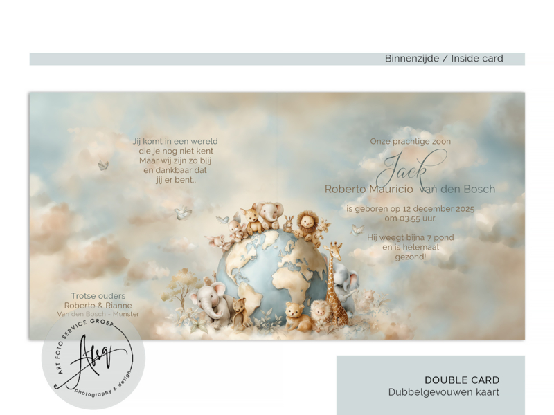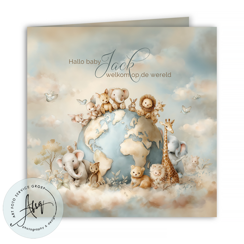 Dit unieke geboortekaartje zonder foto laat zien hoe de hele wereld jullie kindje verwelkomt. Het ontwerp toont een mooie wereldbol, omringd door lieve jungledieren zoals een olifant, leeuw, giraffe en vosje, zacht getekend tussen wolken en pastelkleuren.