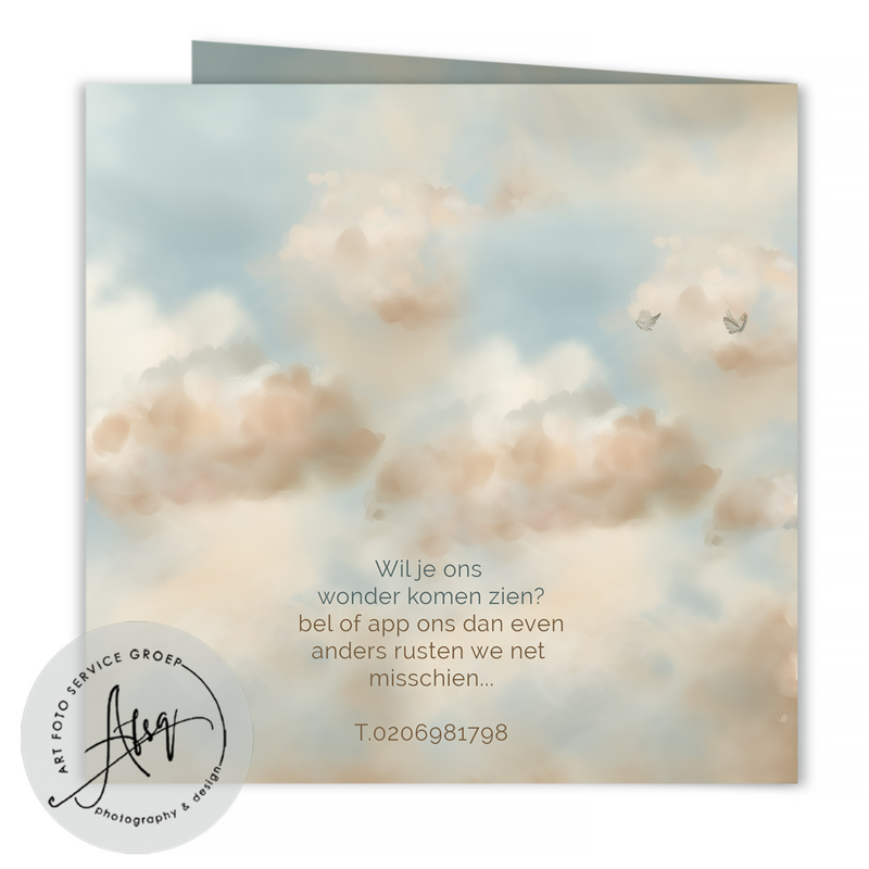 Kaart formaten | 11x11cm gesloten | 11x22cm opengevouwen 13x13cm gesloten | 13x26cm opengevouwen 15x15cm gesloten | 15x30cm opengevouwen 20x20cm gesloten | 20x40cm opengevouwen (XL) |