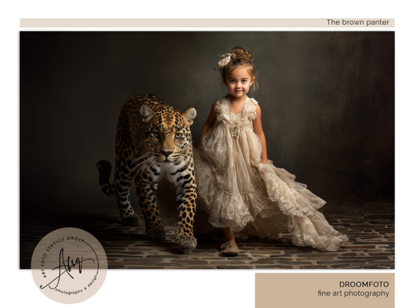 Een krachtige én sprookjesachtige compositie: jouw kind zij aan zij met een statige panter. Deze droomfoto ademt elegantie, fantasie en moed — perfect als kunstwerk voor aan de muur, fine-art afdruk of decoratie voor de kinderkamer. Met professionele bewerking, realistische details en sfeervolle belichting creëren we een beeld dat tijdloos indruk maakt.