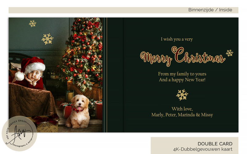 De tekst op de kaart kan volledig worden aangepast. Voeg je eigen kerstwens, namen of persoonlijke boodschap toe – wij passen het ontwerp graag voor je aan.