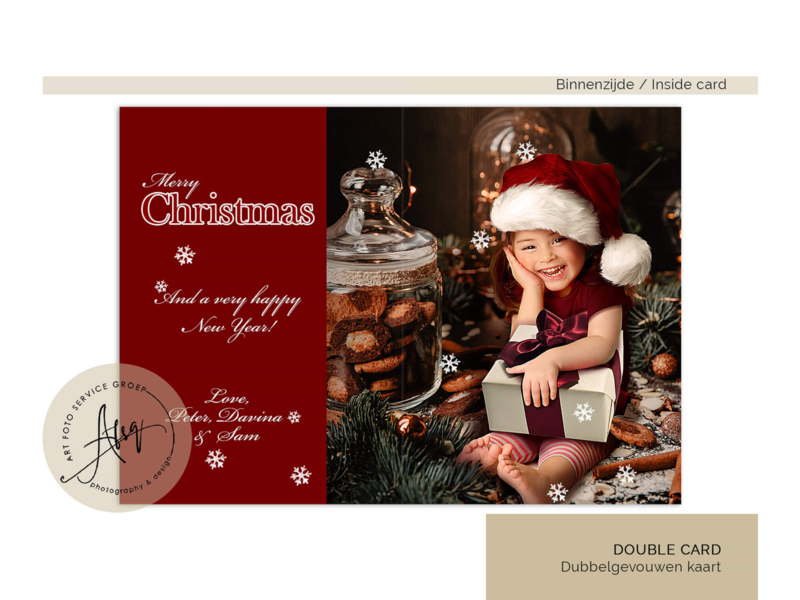 De tekst op de kaart kan volledig worden aangepast. Voeg je eigen kerstwens, namen of persoonlijke boodschap toe – wij passen het ontwerp graag voor je aan.