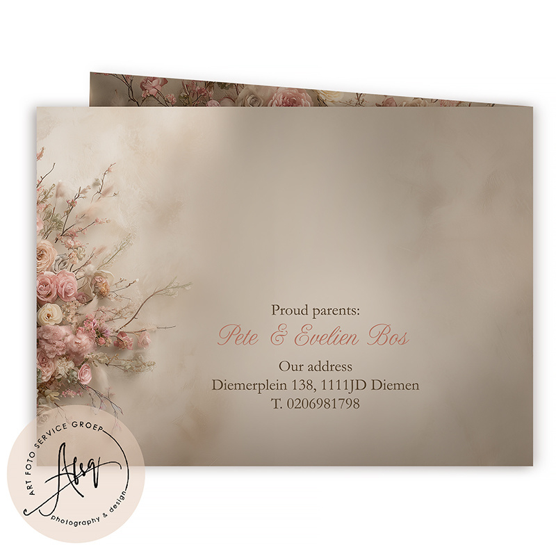 Dit betoverende droom geboortekaartje toont een baby die vredig ligt te slapen in een mandje met prachtige pastel kleurige bloemen. De bloemenmand is opgebouwd uit delicate bloesems en takjes in warme, natuurlijke tinten, wat zorgt voor een romantische en sprookjesachtige uitstraling. De rustige achtergrond en verfijnde details geven het kaartje een luxe en dromerige sfeer. Het ontwerp wordt volledig gepersonaliseerd met de foto van jullie kindje en eigen tekst, en is perfect om de geboorte op een zachte, stijlvolle en tijdloze manier aan te kondigen.