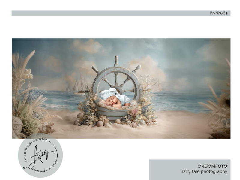 The Little Sailor is een betoverende droomfoto waarin jouw baby wordt afgebeeld als een kleine zeeman, veilig rustend in een maritieme wereld van zee, zand en zachte natuurlijke tinten. Het scheepswiel, de kust en de serene sfeer symboliseren avontuur, geborgenheid en een nieuw begin.
