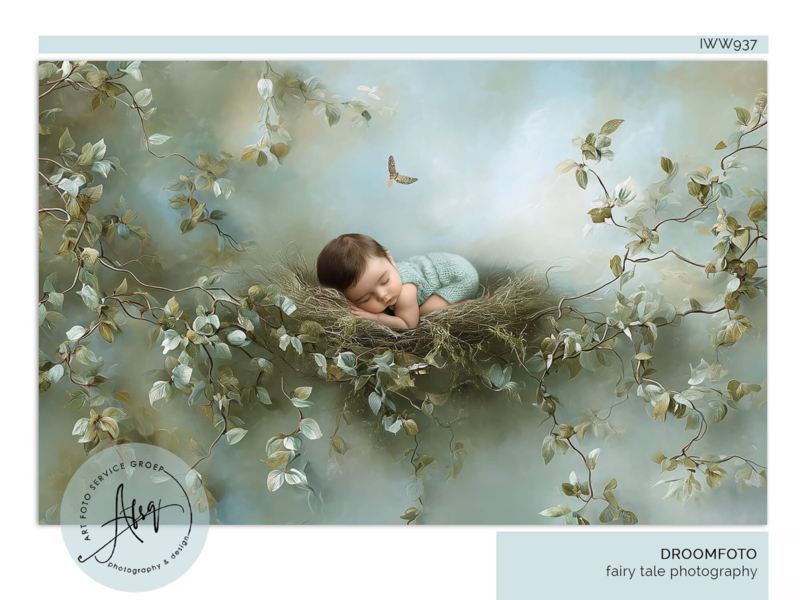 Nestled in Nature is een dromerige fine-art droomfoto waarin je baby wordt vastgelegd als een klein wonder, veilig en geborgen in een zacht vogelnest. Omringd door verfijnde takjes, zachte bladeren en een subtiele vlinder straalt deze droomfoto rust, puurheid en natuurlijke magie uit.