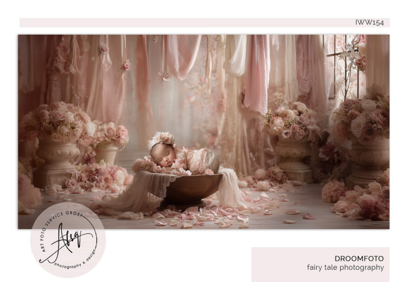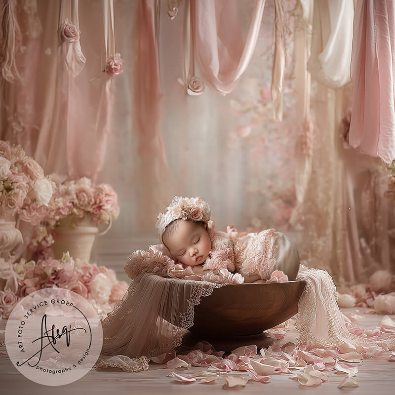 Het delicate decor, het luxueuze kleurgebruik en de artistieke afwerking maken deze droomfoto een waar kunstwerk dat voor altijd gekoesterd kan worden. Perfect voor ouders die houden van elegante, zachte en betoverende foto’s die hun kindje laten stralen als een klein wonder.