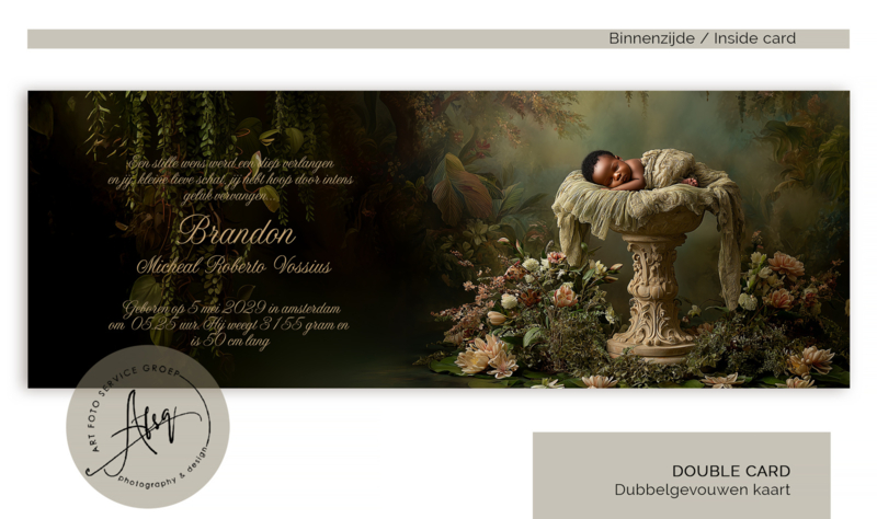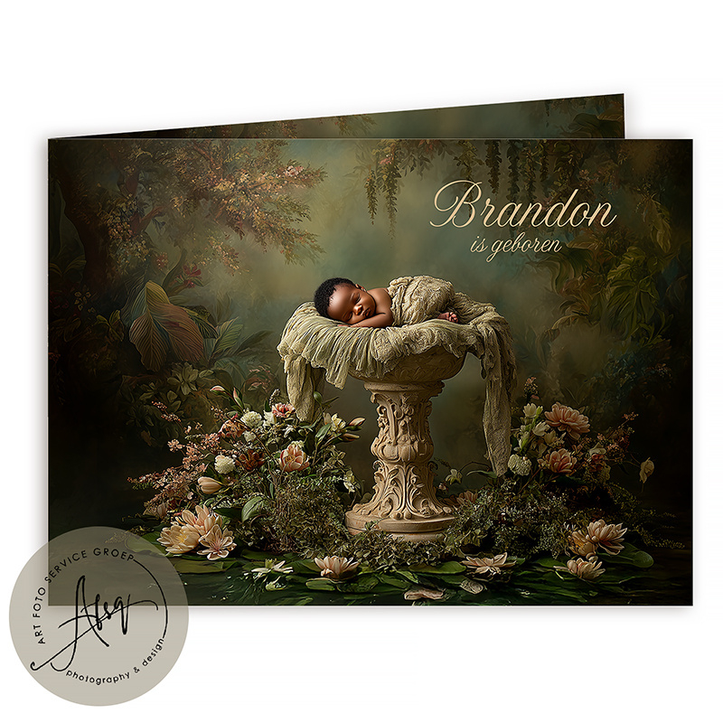 De zachte groentinten, romantische bloemen en de klassieke fontein creëren een serene, luxe uitstraling die jouw kindje laat stralen. Dit geboortekaartje heeft een exclusieve en kunstzinnige uitstraling—een prachtig en persoonlijk ontwerp waarmee je de komst van jullie wonder op een unieke manier deelt.