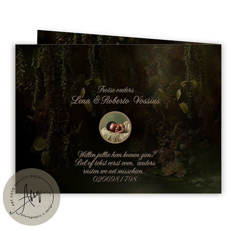 Het Droom Geboortekaartje – Forest Fountain combineert het unieke sprookjesdecor van de droomfoto met een stijlvolle, natuurlijke geboorteaankondiging.