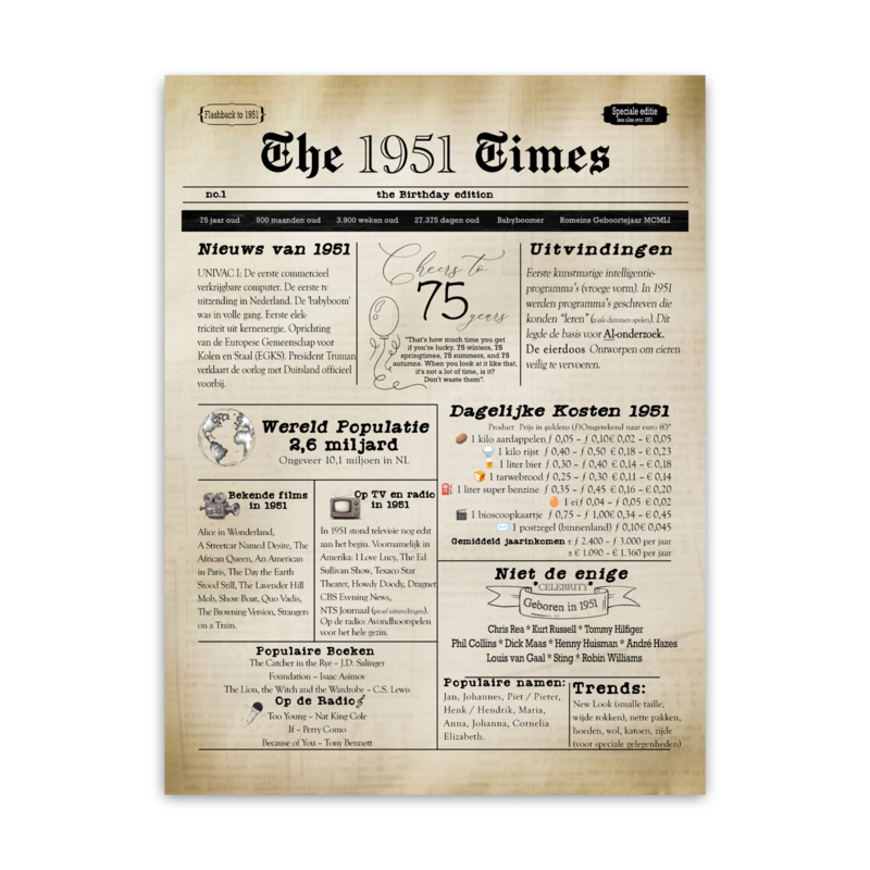 Wordt iemand 75 jaar? Dat verdient een bijzonder cadeau! Met deze unieke 75 jaar Birthday Edition poster blik je terug op het geboortejaar 1951. De poster is vormgegeven als een vintage krant en staat vol met leuke weetjes, trends en herinneringen uit dat jaar.