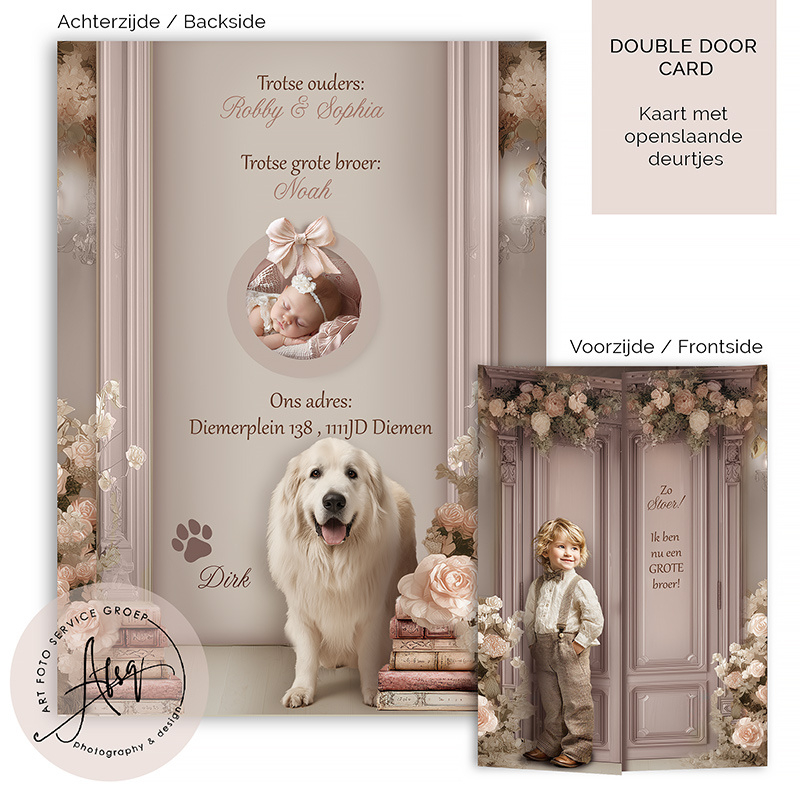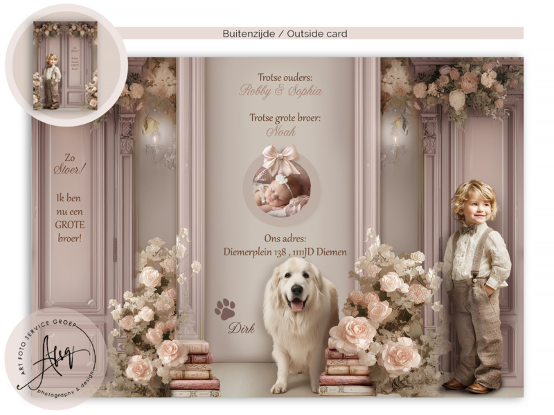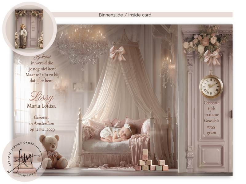 Jouw eigen babyfoto wordt door ons professioneel bewerkt en naadloos in de droomsfeer geplaatst. Het resultaat is een uniek, sprookjesachtig geboortekaartje dat voelt alsof het zo uit een nostalgisch prentenboek komt. Met ruimte voor alle geboortegegevens én op de voorzijde kan een grote broer of zus om de baby aan te kondigen.