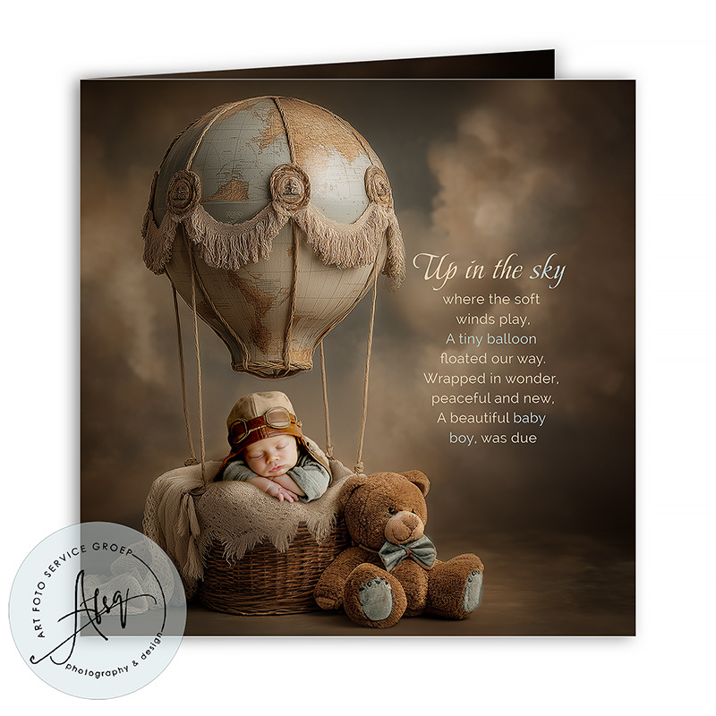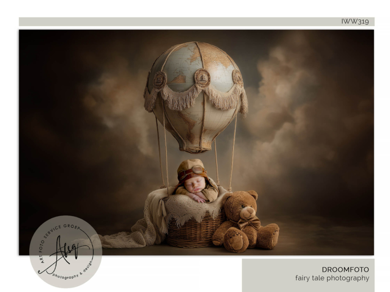 De diepe, schilderachtige achtergrond en het nostalgische kleurenpalet geven deze setting een tijdloze fine-art uitstraling. De subtiele details – van het pilotenmutsje tot de verweerde ballon – zorgen voor een verhaal vol fantasie en warmte.