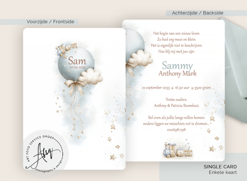 Op de voorzijde staat de naam en geboortedatum centraal, subtiel omringd door zachte tinten en speelse details. De achterzijde biedt ruimte voor een mooie welkomsttekst, de geboortegegevens en de gegevens van de trotse ouders. Het kleine treintje onderaan maakt het ontwerp helemaal af.
