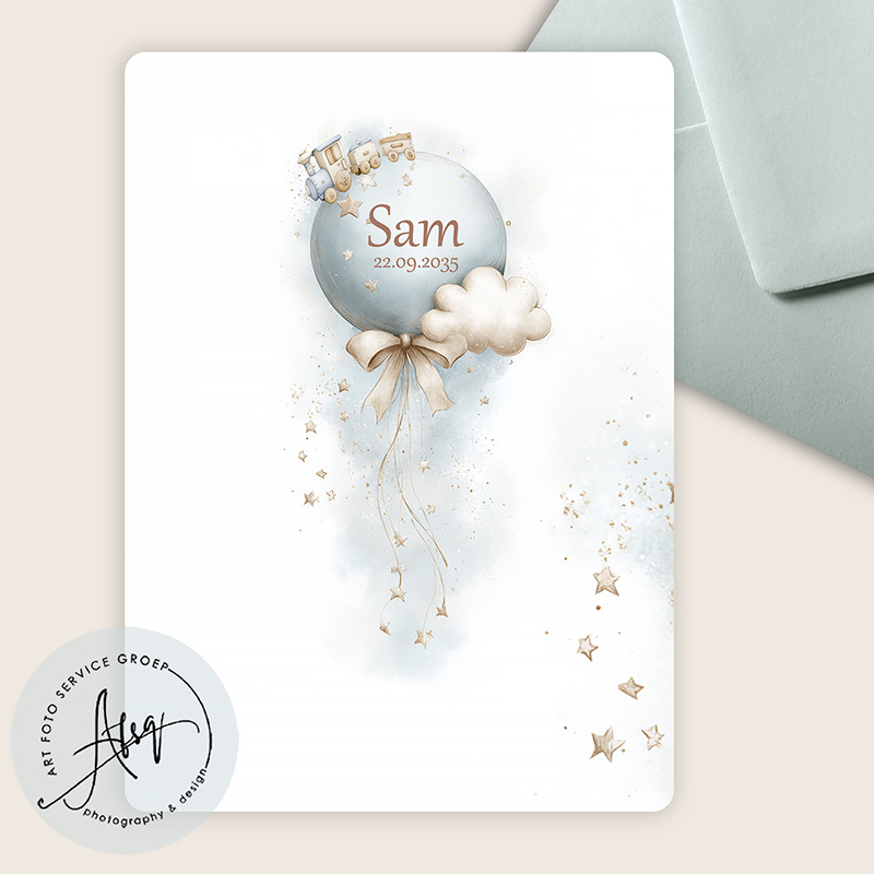 Dit prachtige enkele geboortekaartje met afgeronde hoeken straalt rust, zachtheid en magie uit. De illustratie van een ballon met strik, wolkjes en zwevende sterretjes geeft het kaartje een dromerige uitstraling die perfect past bij de geboorte van een jongen.