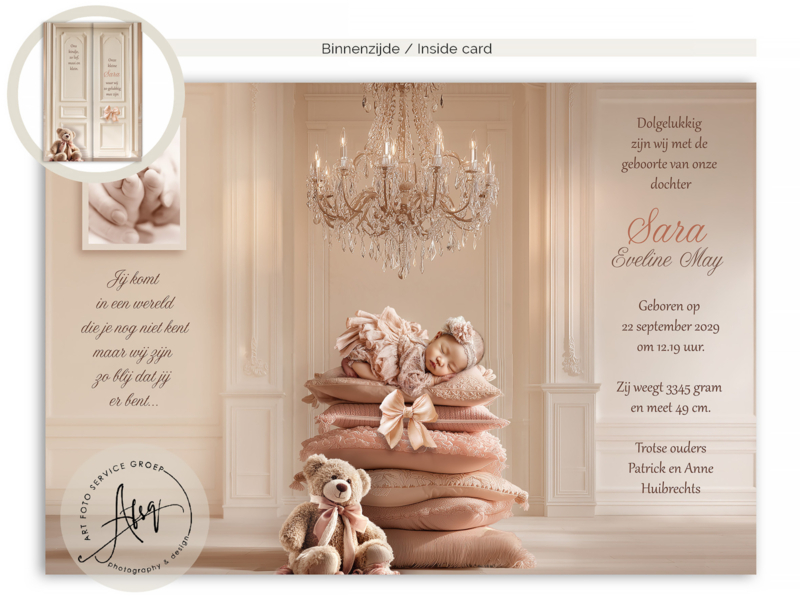 Jouw eigen babyfoto wordt door ons professioneel bewerkt en naadloos in de droomsfeer geplaatst. Het resultaat is een uniek, sprookjesachtig geboortekaartje dat voelt alsof het zo uit een nostalgisch prentenboek komt. Met ruimte voor alle geboortegegevens én op de voorzijde kan een grote broer of zus om de baby aan te kondigen.