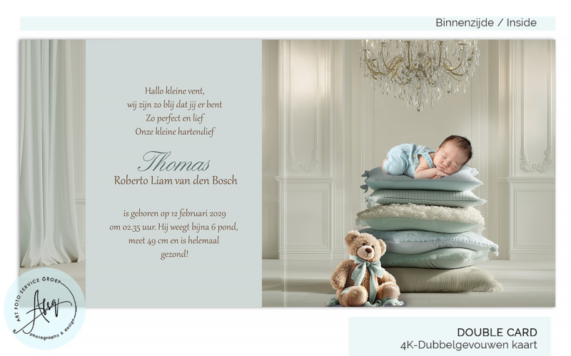 Droom geboortekaartje met eigen foto met lieve kussentjes en een kroonluchter- GB620B