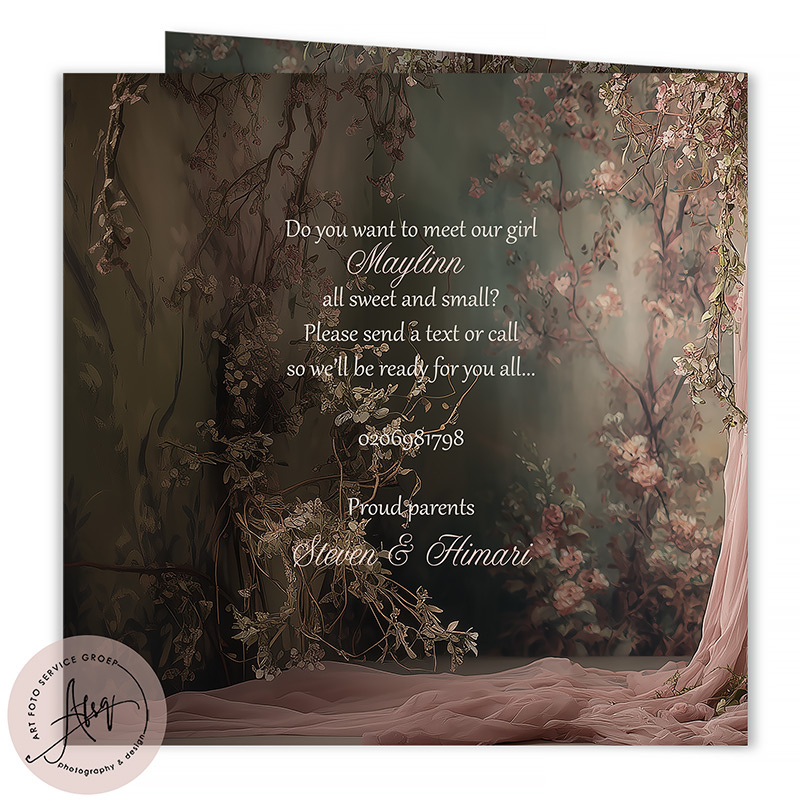 Dit geboortekaartje is een luxueus en sprookjesachtig ontwerp waarin jouw eigen babyfoto tot leven komt. Omhuld door roze, sierlijke bloemen en takken en een romantische-setting ontstaat een warme en magische sfeer die perfect past bij een liefdevolle geboorteaankondiging.