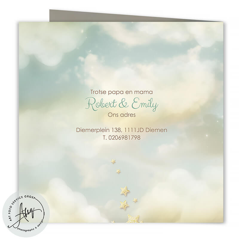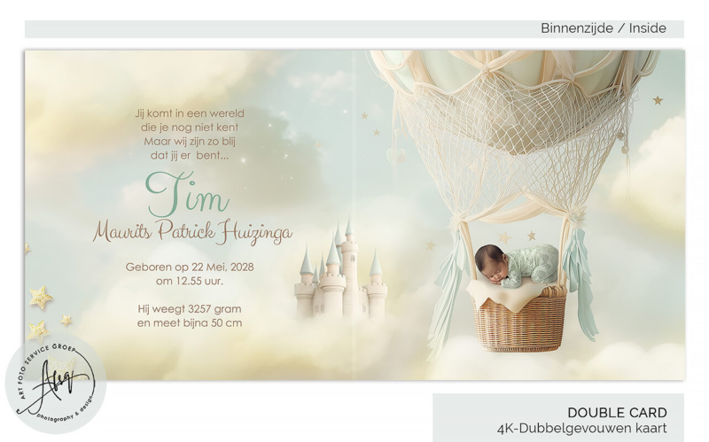 Een sprookjesachtig geboortekaartje waarin wij de foto van jullie baby verwerken. Het ontwerp toont een luchtballon tussen wolken en sterren met een kasteel op de achtergrond. Zo ontstaat een persoonlijke en dromerige kaart waarmee jullie de geboorte van jullie kindje op een bijzondere manier kunnen aankondigen. Perfect voor wie op zoek is naar een warme, stijlvolle en betoverende uitstraling.