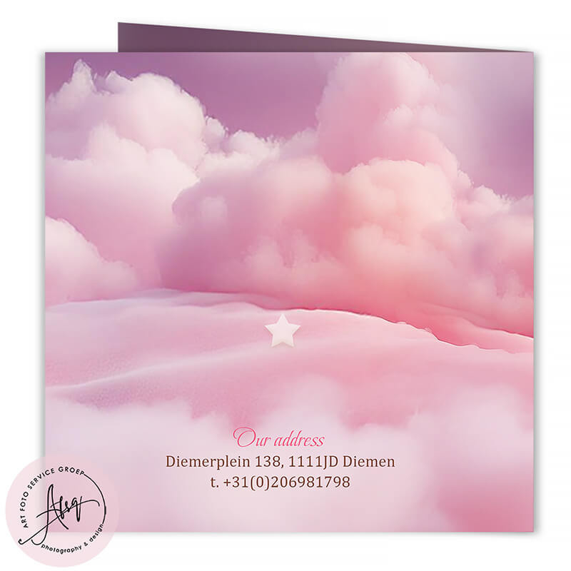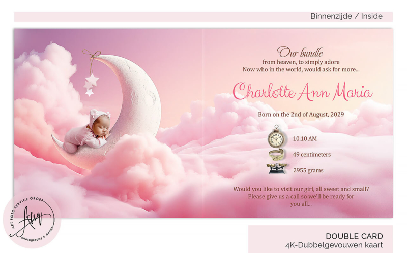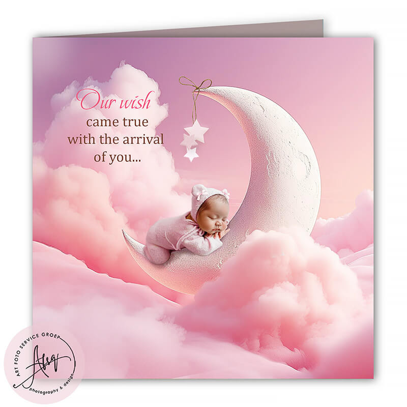 Prachtig geboortekaartje met een dromerig ontwerp van een baby op een maan tussen zachte roze wolken. Dit kaartje maken wij persoonlijk voor jullie met de foto van jullie eigen kindje, zodat het een liefdevolle en blijvende herinnering wordt. Perfect voor een sprookjesachtige geboorteaankondiging.