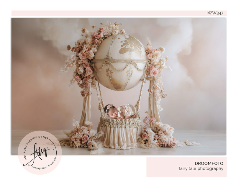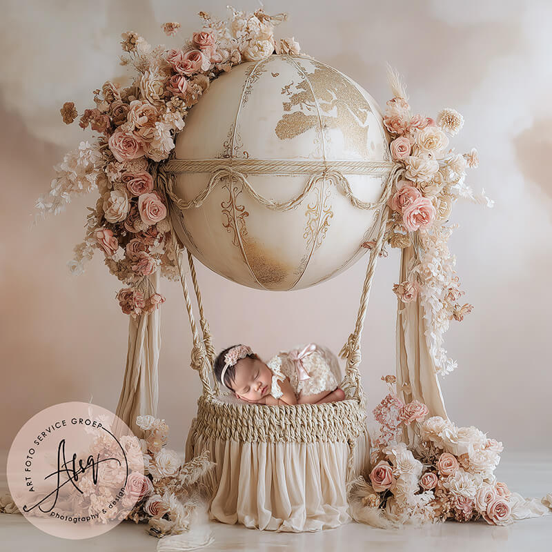 The Little Flower Balloon – een zacht en poëtisch kunstwerk waarin jouw baby zweeft tussen bloemen en droomlicht. Deze fine-art droomscène toont jouw kindje slapend in een romantische luchtballon, rijk versierd met rozen, hydrangea’s en zachte beige- en blush tinten. De elegante stoffen, luxueuze details en rustige kleuren maken deze foto onweerstaanbaar warm en sierlijk.