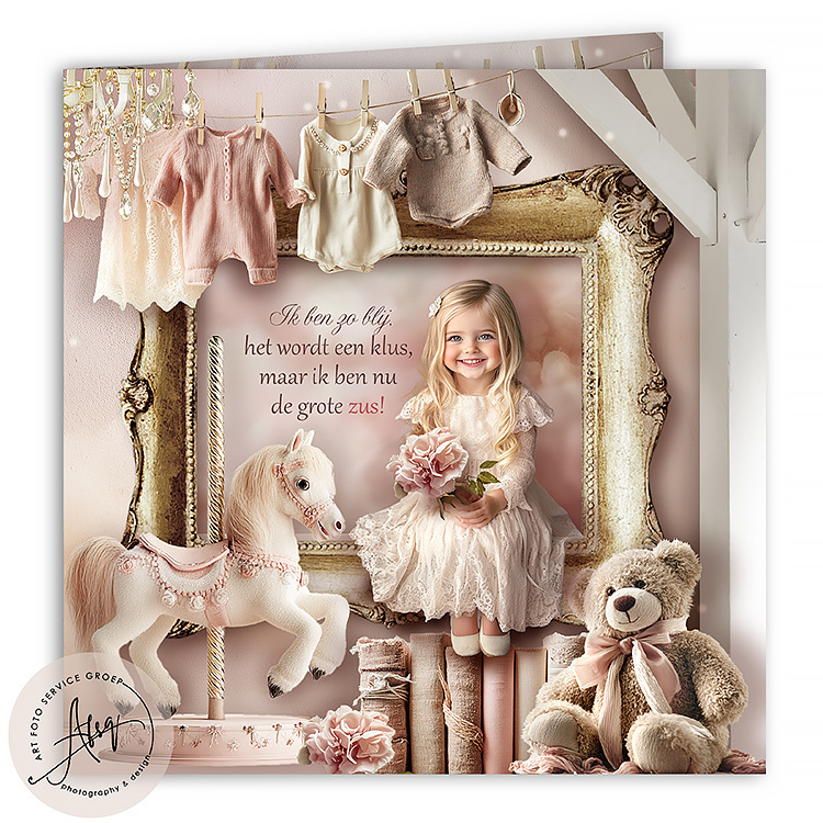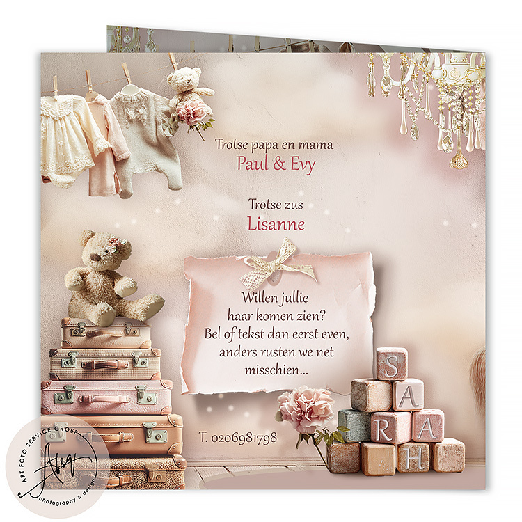 Je kunt de kaart personaliseren met naam, tekst en foto. Past bij thema’s zoals babykamer, vintage, roze, zusjes en droomstijl. Ook verkrijgbaar in een jongensvariant.