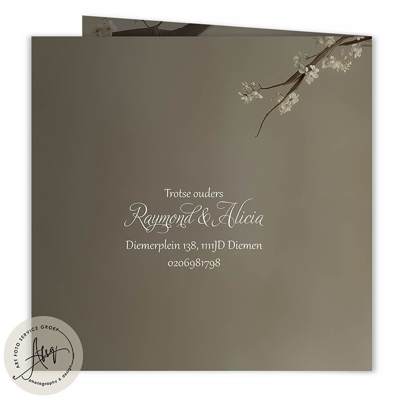 Maak de geboorte van jullie kindje onvergetelijk met dit luxe geboortekaartje met eigen babyfoto. Het ontwerp toont een sierlijke schommel met bloesemtakken en zachte tinten, waardoor de foto van jullie kindje prachtig tot zijn recht komt.