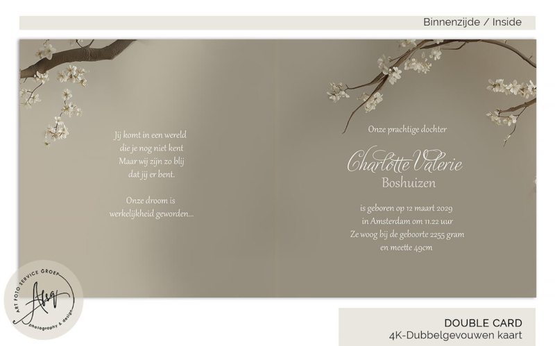 Wij bewerken de foto zorgvuldig en passen de kleuren en details perfect aan op het ontwerp. Zo ontstaat een warm, stijlvol en persoonlijk geboortekaartje dat jullie kleintje op een unieke manier aankondigt.