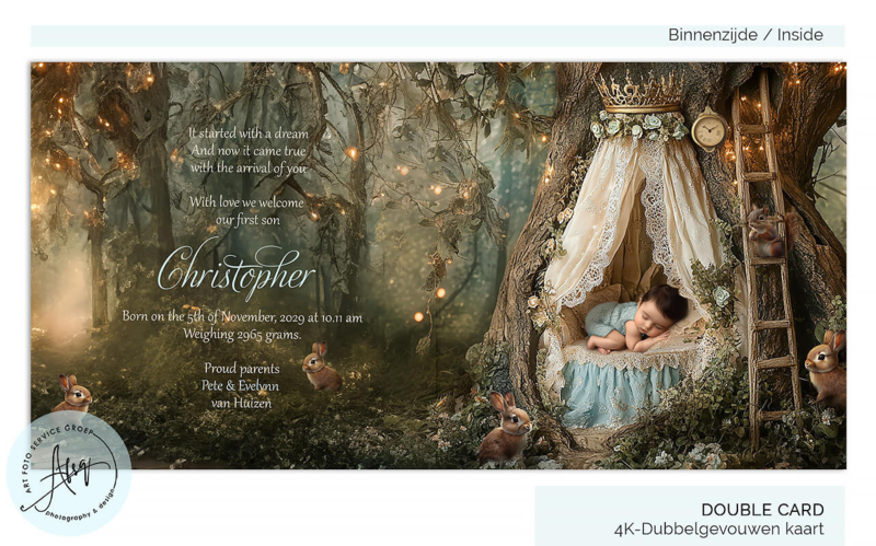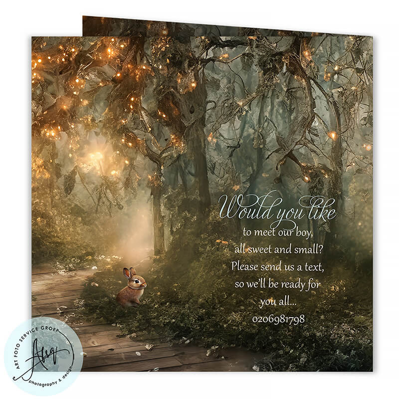 Laat jullie kindje schitteren in dit betoverende geboortekaartje. Het ontwerp toont een sfeervol sprookjesbos met een boomholte, fonkelende lichtjes en lieve dieren zoals konijntjes en eekhoorntjes. Jullie baby wordt met zorg in deze magische setting geplaatst, waardoor elk kaartje een persoonlijk kunstwerk wordt. Een droomachtige manier om de geboorte van jullie kleintje aan te kondigen en familie en vrienden te verrassen met een uniek aandenken.