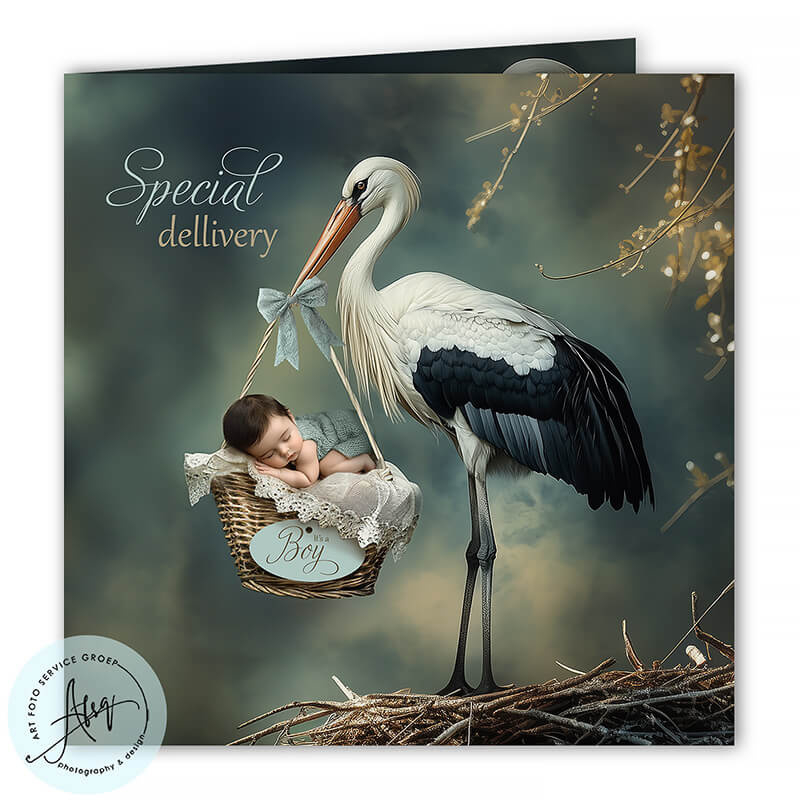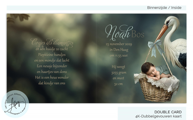 Dit bijzondere geboortekaartje toont jouw baby in een mandje, liefdevol gedragen door een elegante ooievaar met strik. Het sprookjesachtige ontwerp is perfect om de komst van jullie kindje groots en stijlvol aan te kondigen. Wij verwerken met zorg de foto van jullie baby in deze dromerige setting, zodat elk kaartje een uniek en persoonlijk kunstwerk wordt. Een onvergetelijke manier om familie en vrienden te verrassen met jullie mooie nieuws.