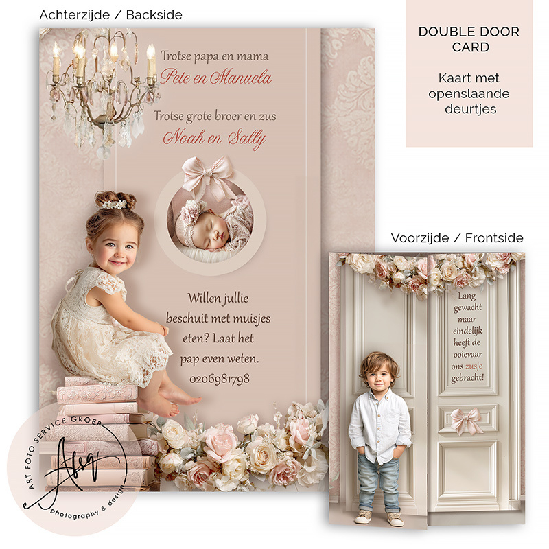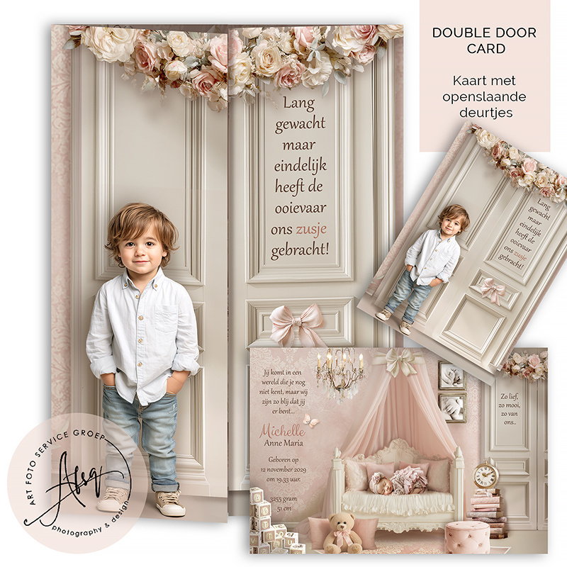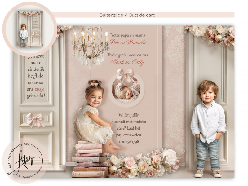 Dit luxe Droom Geboortekaartje van een romantische babykamer is een prachtig sprookjesachtig ontwerp waarin jouw kindje straalt als de hoofdpersoon in een dromerige wereld. Met zachte kleuren, elegante details en een warm, klassiek decor creëert dit kaartje een onvergetelijke eerste indruk. Zijn er al grote broers of zussen? Op de voorzijde kunnen wij grote broers/zussen plaatsen.