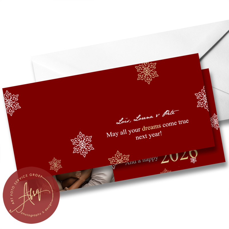 Vier de feestdagen in stijl met deze klassieke foto kerstkaart in dieprood met goudaccenten en sierlijke sneeuwvlokken. Jouw eigen foto maakt de kaart extra persoonlijk en zorgt voor een warme en feestelijke uitstraling. Perfect om familie, vrienden of collega’s een vrolijk kerstfeest en een gelukkig nieuwjaar te wensen.