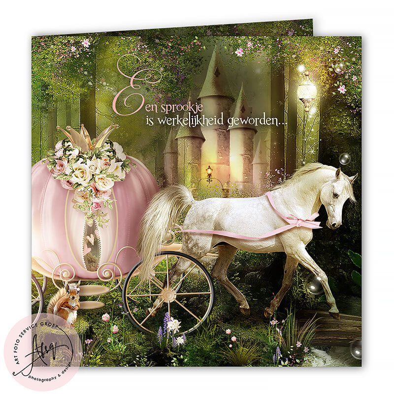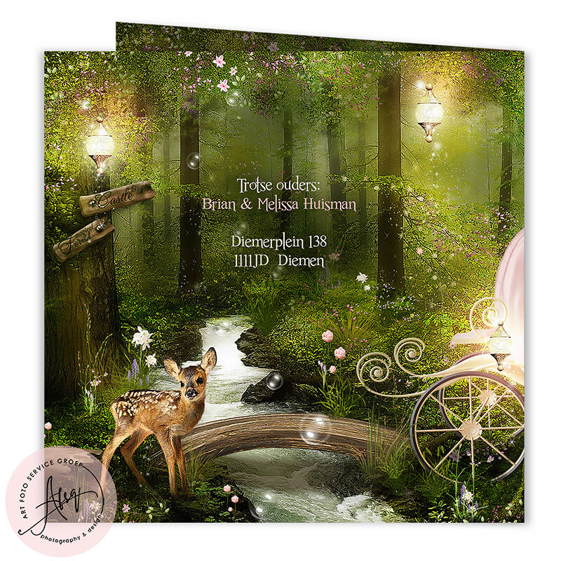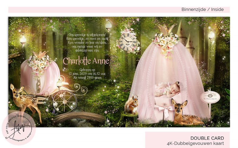 Een betoverende geboortekaart voor een meisje, ontworpen als een echt sprookje. Met een roze koets, wit paard en schattige hertjes straalt dit kaartje luxe en magie uit. Jouw baby wordt liefdevol verwerkt in het sprookjesdecor, waardoor een uniek en persoonlijk geboortekaartje ontstaat. Perfect voor ouders die hun dochter op een bijzondere en onvergetelijke manier willen aankondigen.