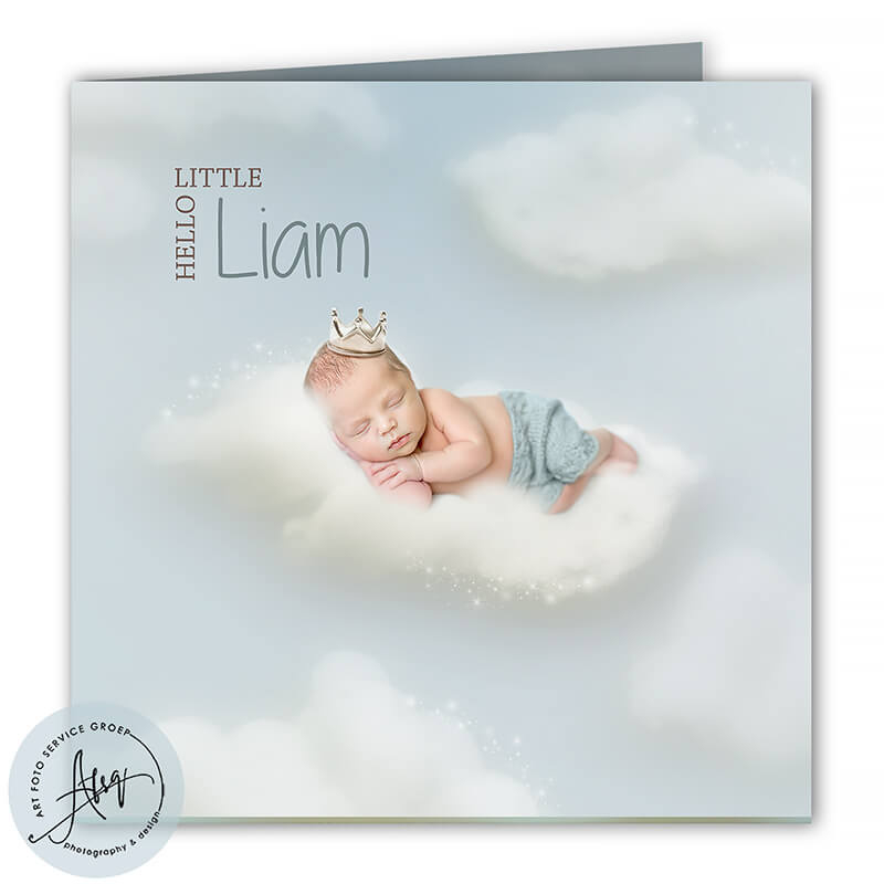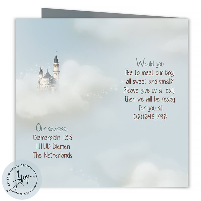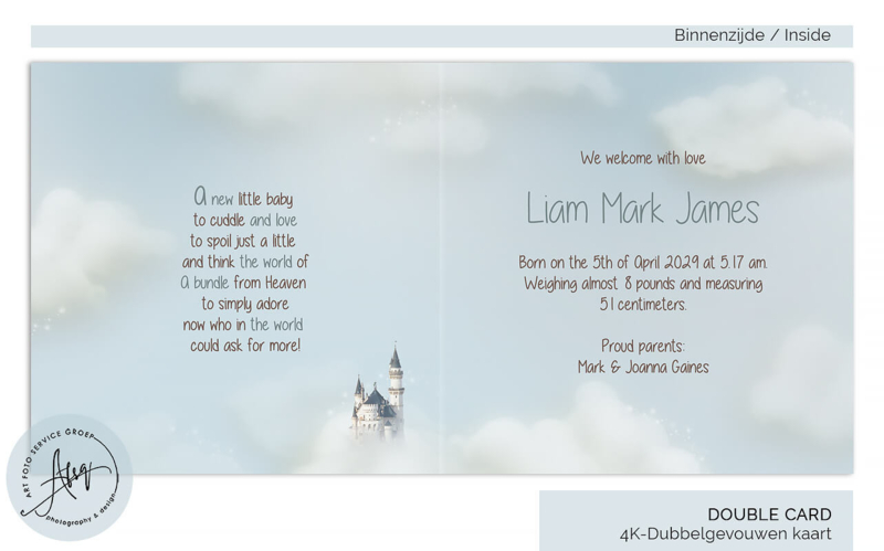Dit sprookjesachtige geboortekaartje voor een jongen laat jouw kindje dromerig slapen op een zachte wolk, met een glanzend kroontje en een kasteel op de achtergrond. De kaart ademt warmte en magie, ideaal om de komst van jullie zoon op een bijzondere manier aan te kondigen. Jouw eigen foto wordt professioneel bewerkt zodat het perfect in dit betoverende ontwerp past.