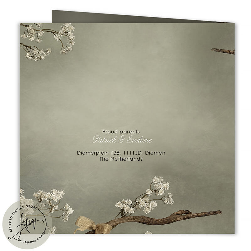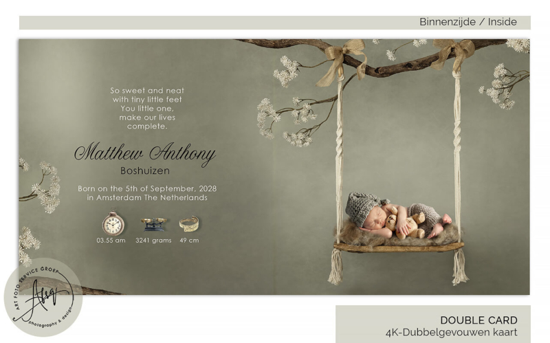 Dit stijlvolle geboortekaartje voor jouw kindje met een schommel onder bloeiende takken. Een warme en serene kaart om de geboorte van jullie kindje aan te kondigen. De zachte kleuren en natuurlijke details zorgen voor een tijdloos en liefdevol ontwerp dat familie en vrienden zal ontroeren.