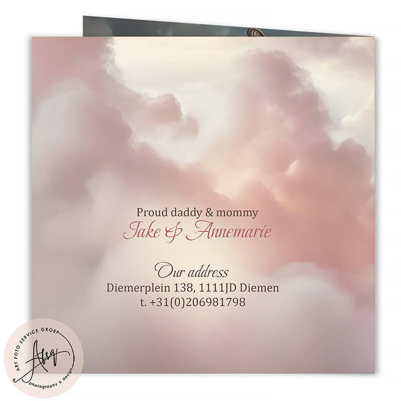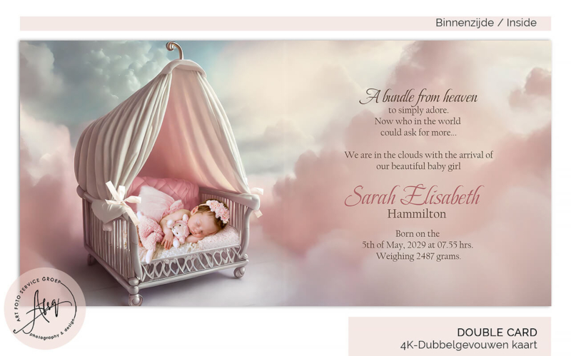 Stijlvol geboortekaartje met een dromerig ontwerp van een baby in een klassiek wiegje omringd door zachte roze wolken. Een liefdevolle manier om de komst van jullie kindje aan te kondigen. Wij verwerken de foto van jullie eigen baby in dit ontwerp, zodat het kaartje volledig persoonlijk wordt en een blijvende herinnering vormt.