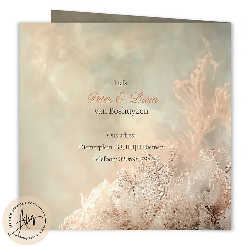 Kaart formaten | 11x11cm gesloten | 11x22cm opengevouwen 13x13cm gesloten | 13x26cm opengevouwen 15x15cm gesloten | 15x30cm opengevouwen 20x20cm gesloten | 20x40cm opengevouwen (XL) |