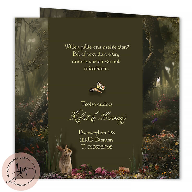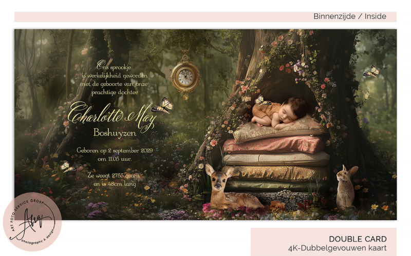 Dit sprookjes geboortekaartje ademt de magie van het bos. Te midden van bomen, bloemen en vlinders ligt jouw kindje prinsheerlijk te slapen op zachte kussens, omringd door hertjes en een nieuwsgierig konijntje. Een dromerig en liefdevol ontwerp waarin wij met zorg de foto van jouw baby verwerken. Perfect om de geboorte van jouw kindje te vieren met een vleugje fantasie en warmte.