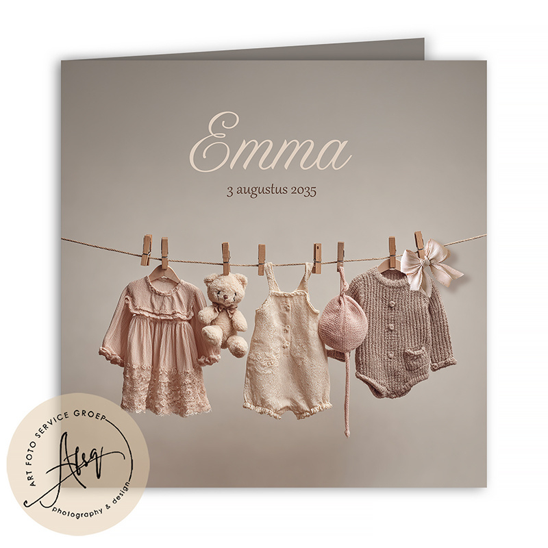 Geboortekaartje met foto met een baby waslijn - FGB157Lief geboortekaartje met babykleertjes aan de waslijn in zachte rozetinten. Elegante, rustige stijl