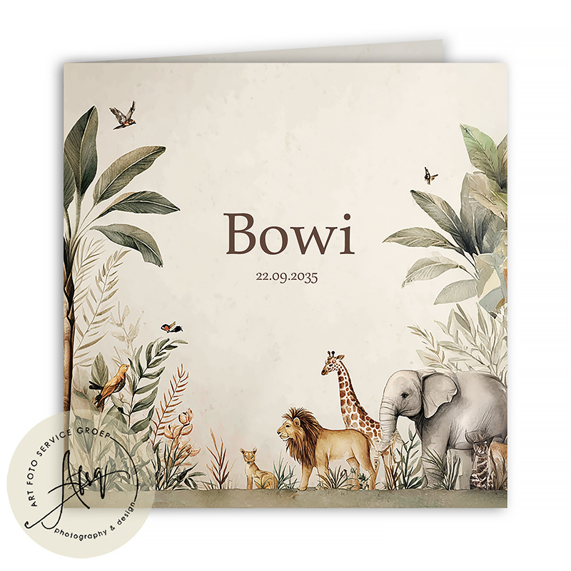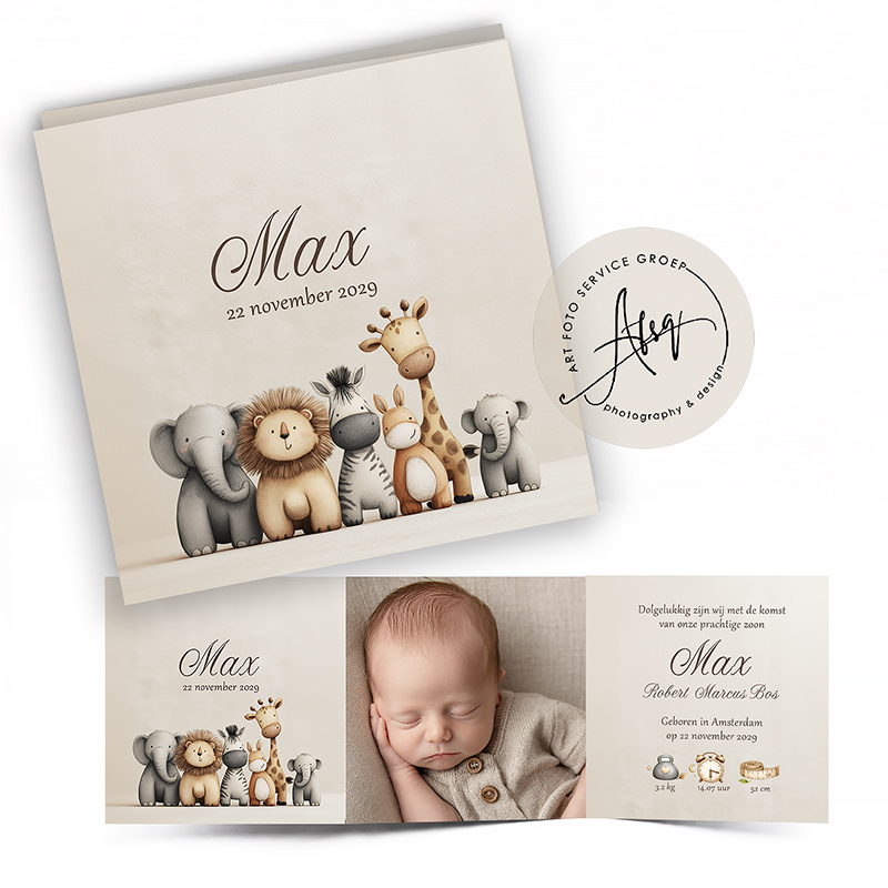 Drieluik Geboortekaartje met wilde dieren - FGB024Luxe drieluik foto geboortekaartje met wilde dieren, foto en geboortegegevens.