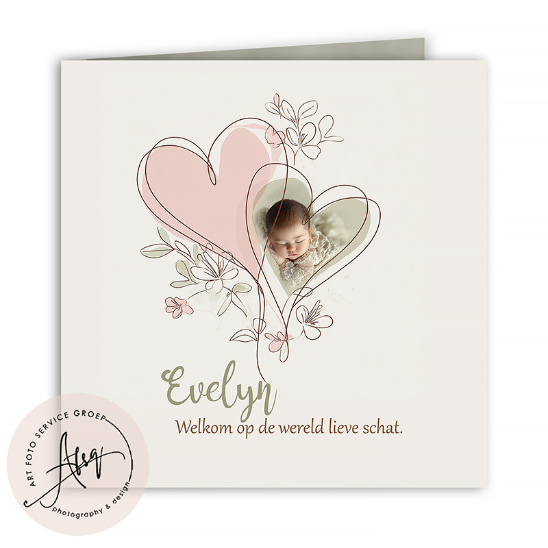 Geboortekaartje met foto met lieve hartjes - FGB602Lief en elegant geboortekaartje met foto. Dubbelgevouwen ontwerp met zachte kleuren en hartjes.