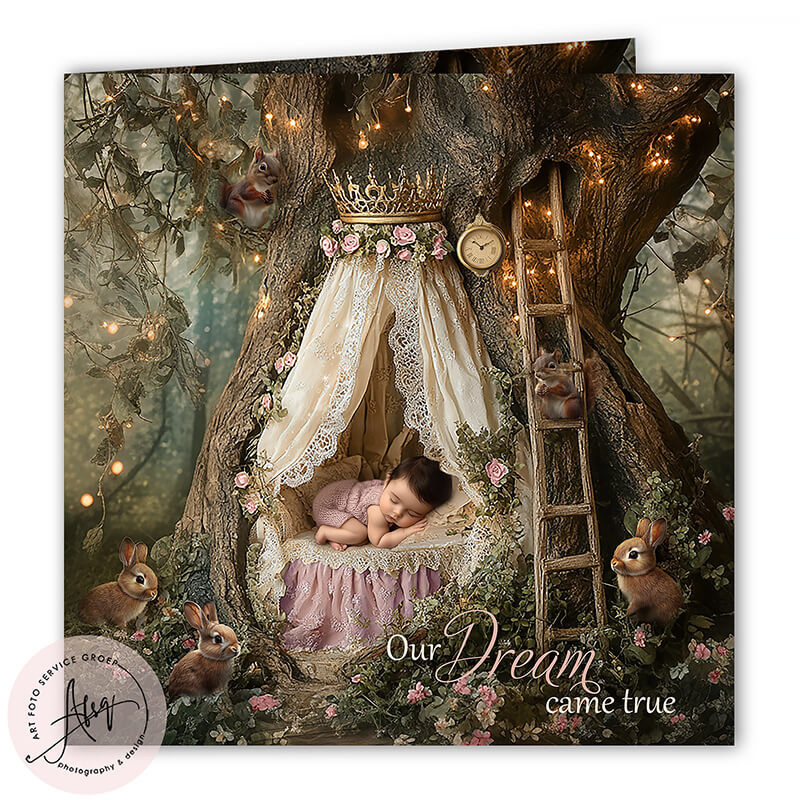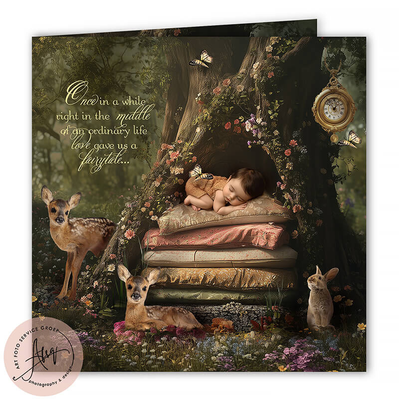 Droom geboortekaart sprookjesbos met eigen babyfoto – GB045Betoverend droom geboortekaartje met de foto van je eigen kindje