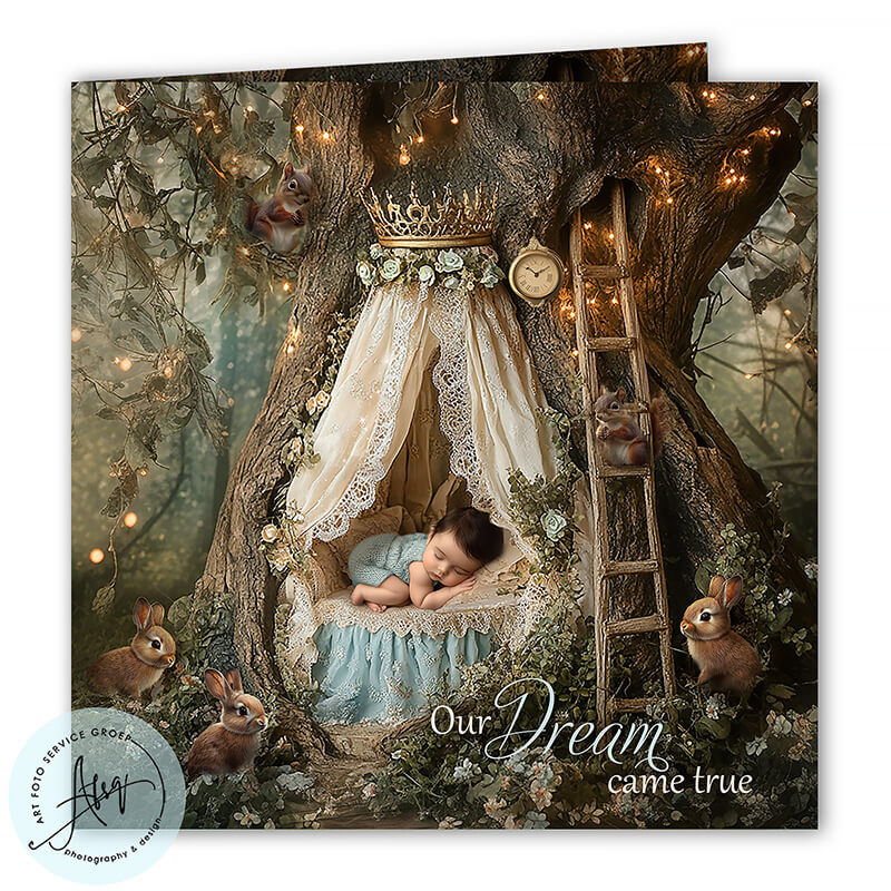 De geboorte van jullie zoon is een bijzonder moment dat vraagt om een kaartje met uitstraling. Onze droom geboortekaartjes voor jongens combineren dromerige achtergronden met stoere én lieve details. Wij bewerken de foto van jullie baby professioneel in het ontwerp, zodat het lijkt alsof hij écht in deze magische setting is gefotografeerd.