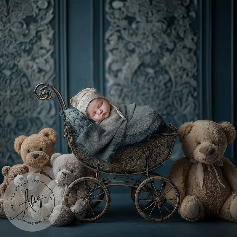 Digitale Droomfoto - The Vintage Teddy Dream -IW348Unieke droomfoto van jouw baby in een vintage kinderwagen, omringd door teddyberen.