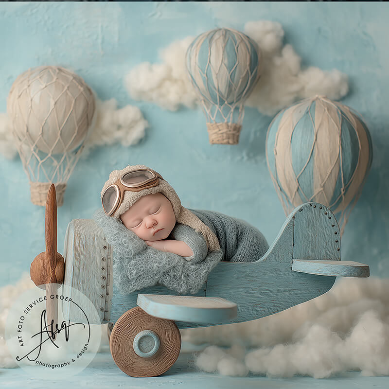 Digitale Droomfoto - Skybound Dreams -IW350Unieke droomfoto van jouw baby als kleine piloot, slapend op een vliegtuigje tussen wolkjes en luchtballonnen.