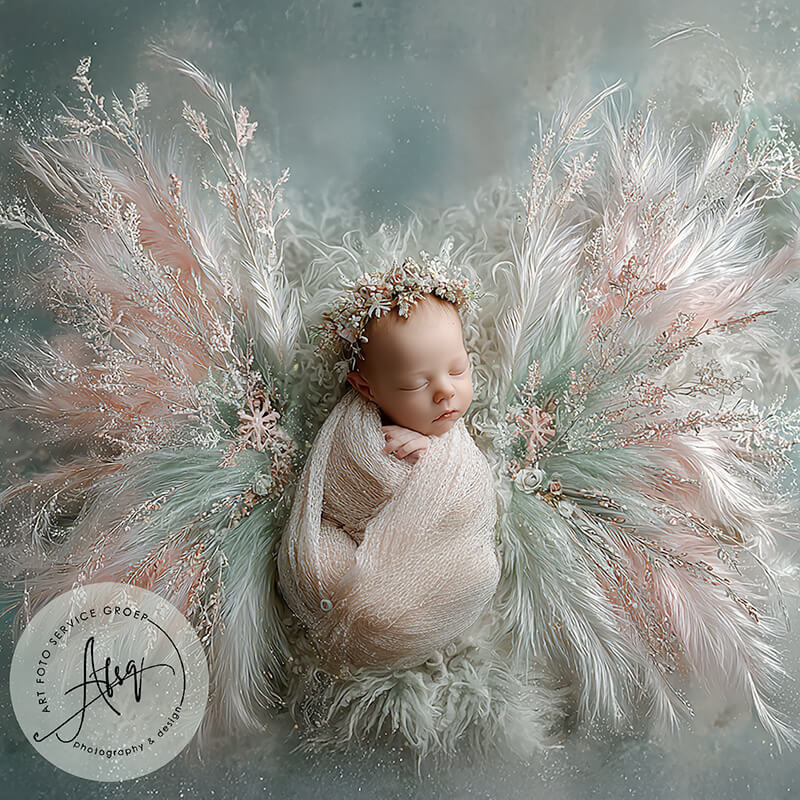 Digitale Droomfoto - Whispering Angel Dreams -IW354Zachte fine-art newbornfoto met engelachtige veren in pastel roze en salie tinten.