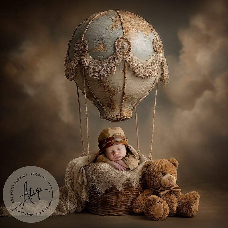 Digitale Droomfoto - Up, up we go! -IW319Dromerige newborn fine-art setting met luchtballon, teddybeer en warme vintage tinten. Perfect voor kleine avonturiers.